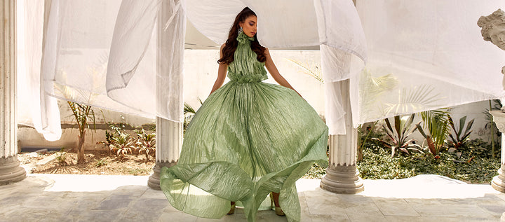This elegant Iris gown is made from pear green lamé chiffon and features intricate hand pleating and an exaggerated frill neckline. Perfect for special occasions, it exudes luxury and sophistication. Dry clean only.