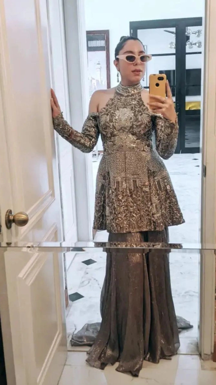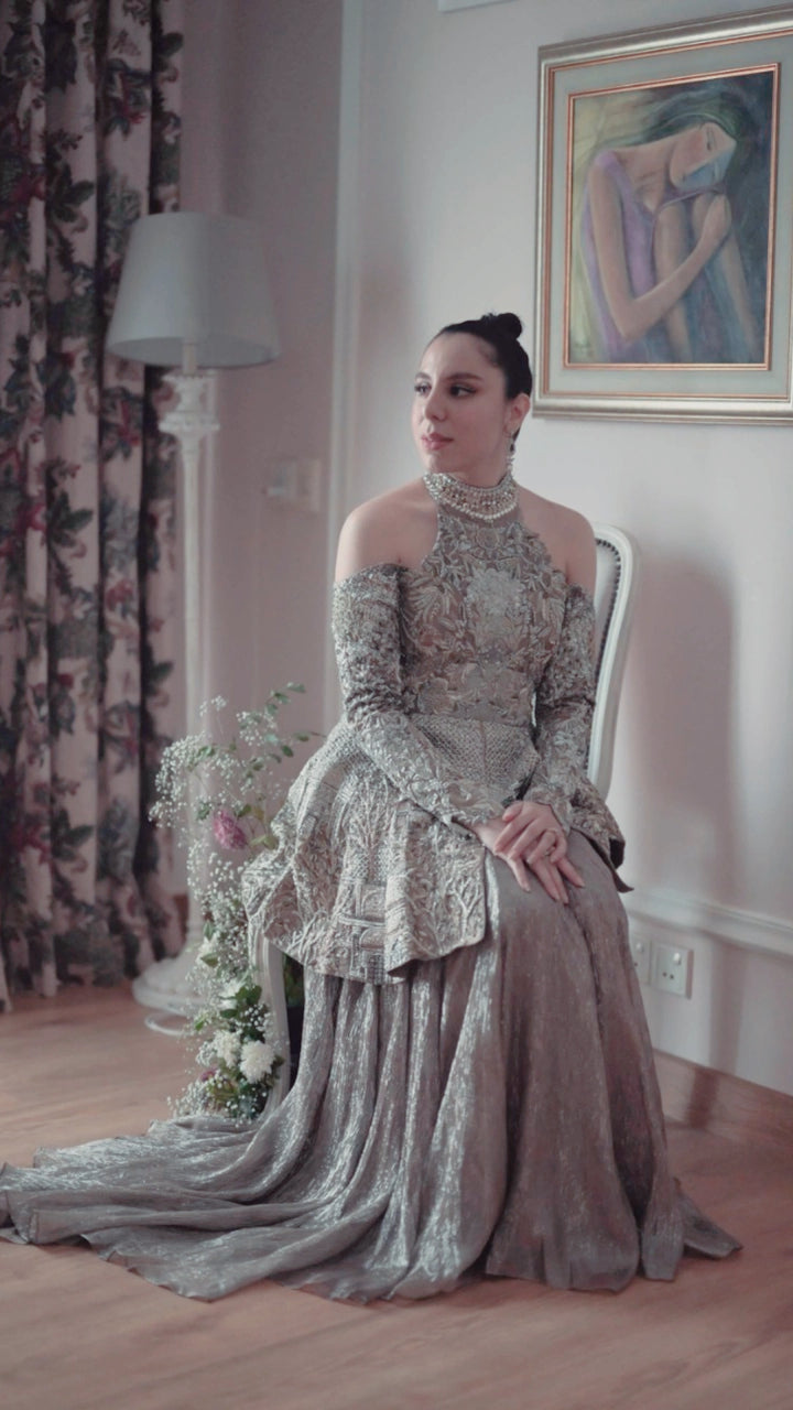 Pewter lamé heavily beaded peplum top with bejewelled halter neck. Paired with lamé chiffon skirt. "Expertly crafted, the Venezia ensemble features a stunning pewter lamé peplum top adorned with intricate beadwork. The bejewelled halter neck adds a touch of elegance to the ensemble. Complete the look with the matching lamé chiffon skirt.